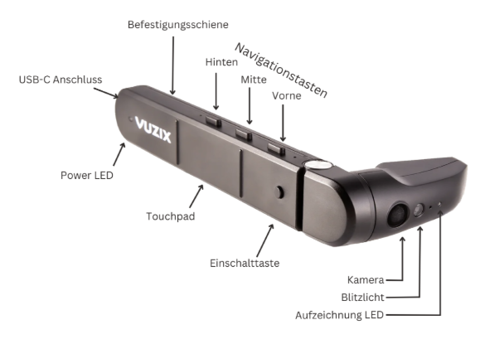 Das AR-Modul unserer CaringEyes-Brille verfügt über eine Vielzahl an Bedienelementen. Anwender können die Brille mit den verschiedenen Tasten oder per Touchpad bedienen sowie die einfache Sprachsteuerung nutzen.